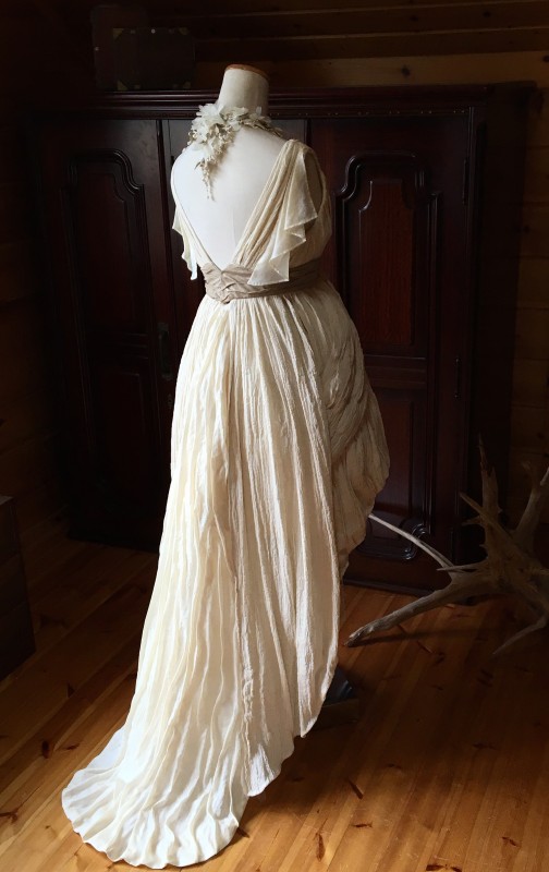 La robe a été majoritairement réalisée en crêpe de coton naturel non teinté et plissé. Après avoir confectionné une base jupon en tulle, j’ai réalisé la robe en moulage sur le mannequin, afin d’avoir des plis et des mouvements très naturels. Le côté droit de la jupe a été travaillé en volume avec du rembourrage, comme des racines, et l’ourlet main du bas de jupe est inséré de fil de fer afin de lui donner une forme ondulante. La traîne, tout comme les manchettes a été elle réalisée en soie non teintée, plissée à la main et fixée à la vapeur. La ceinture taille haute est réalisée en cuir beige ciré de blanc et plissé à la main sous forme de veinures soulignées ensuite de doré. Enfin le collier végétal a été confectionné en guipure, pétales de mousseline, feuilles et fleurs réalisés à la main dans le même cuir.