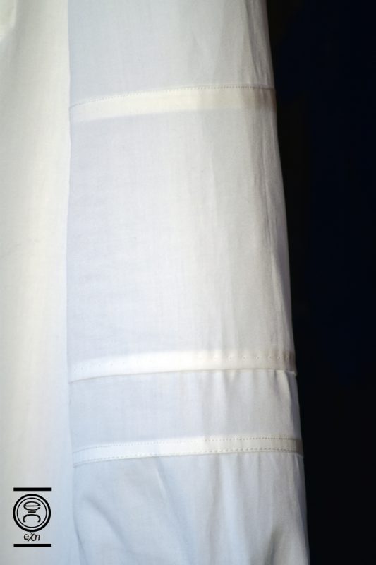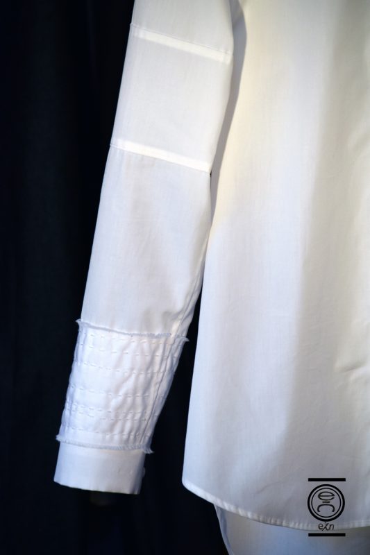Shirt with asymmetric sleeves made of different pieces overstitched by sewing machine or by hand. The right wrist is made of thick cotton overstitched by hand in a “Sashiko” style. Chest welt pocket entirely overstitched by hand using a kimono technique.